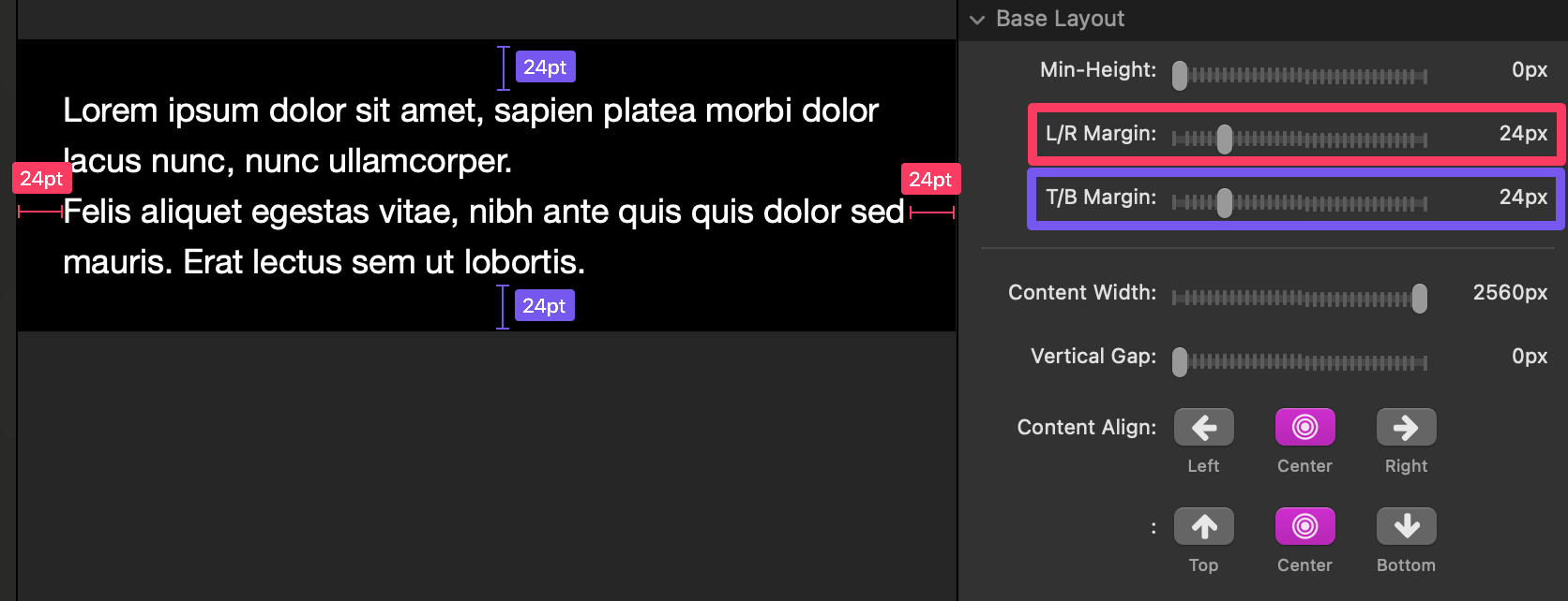 - L/R Margin adds space left/right of the container (you’ll notice it most when the container’s width reaches the edges of its parent).
