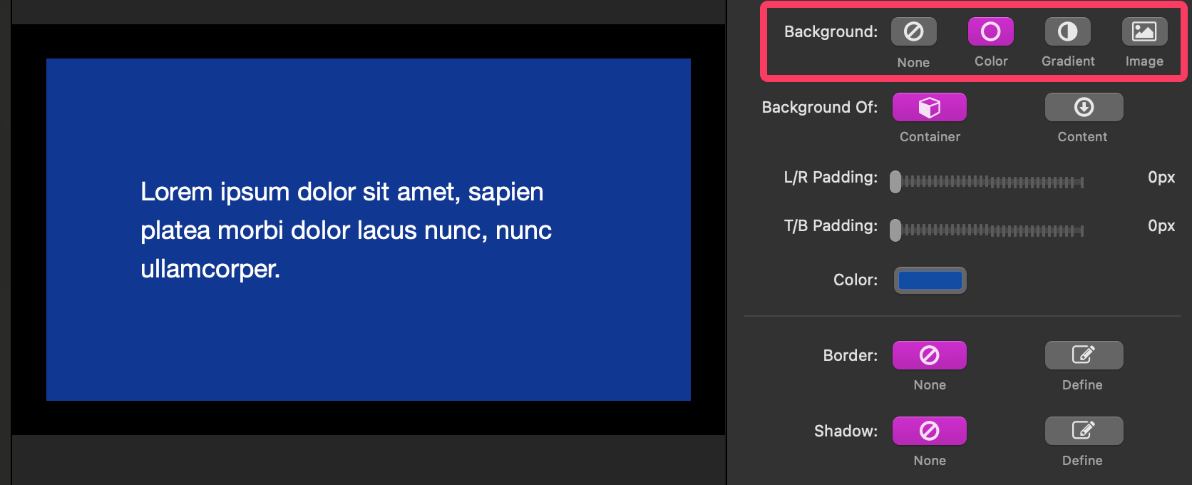 - Border & Shadow controls are exposed if you have added a Color, Gradient, or Image background. They apply to the same area as Background Of (Container or Content). Use this to create cards, callouts, and framed sections.