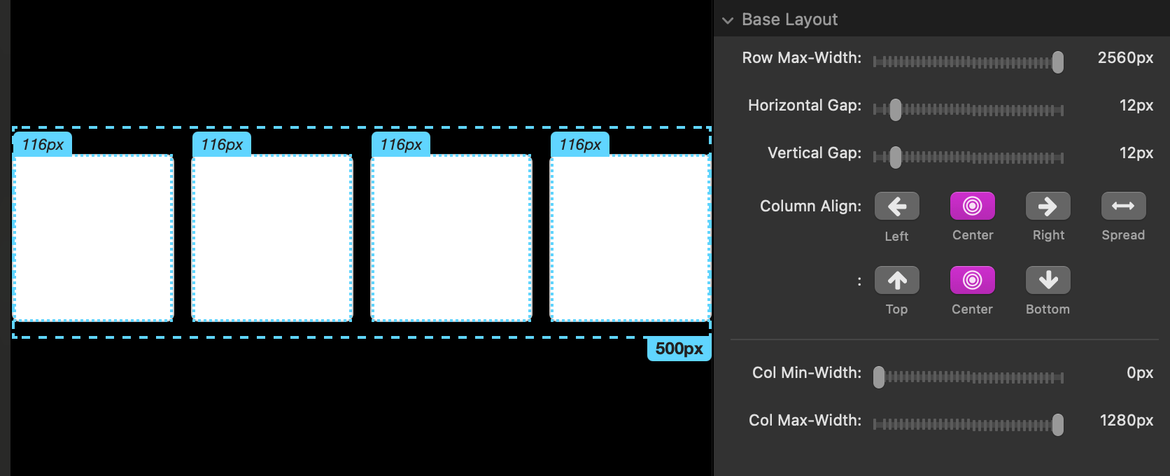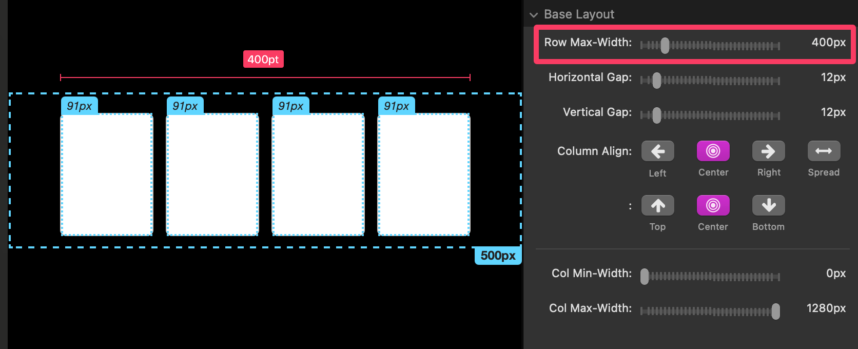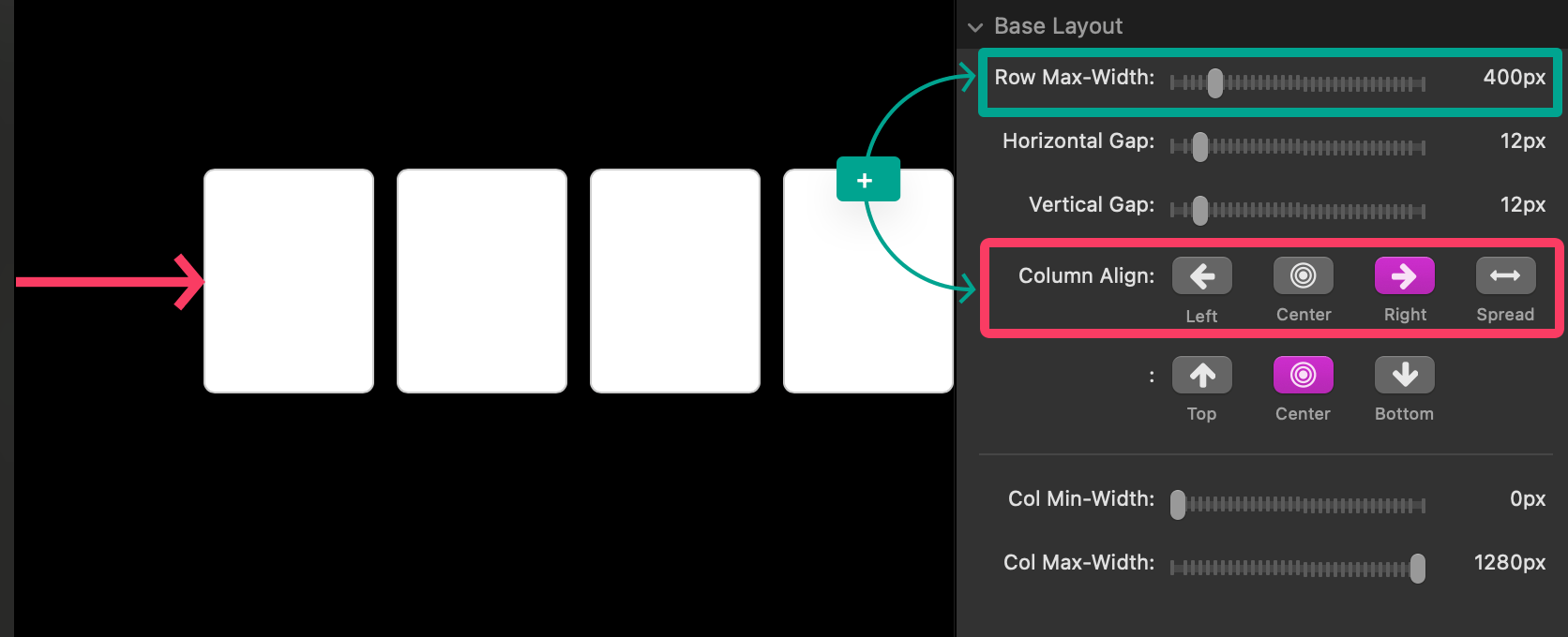 - If (columns × Col Max-Width) + (gaps) is less than Row Max-Width, Column Align (Left/Center/Right/Spread) determines how the leftover space is handled.