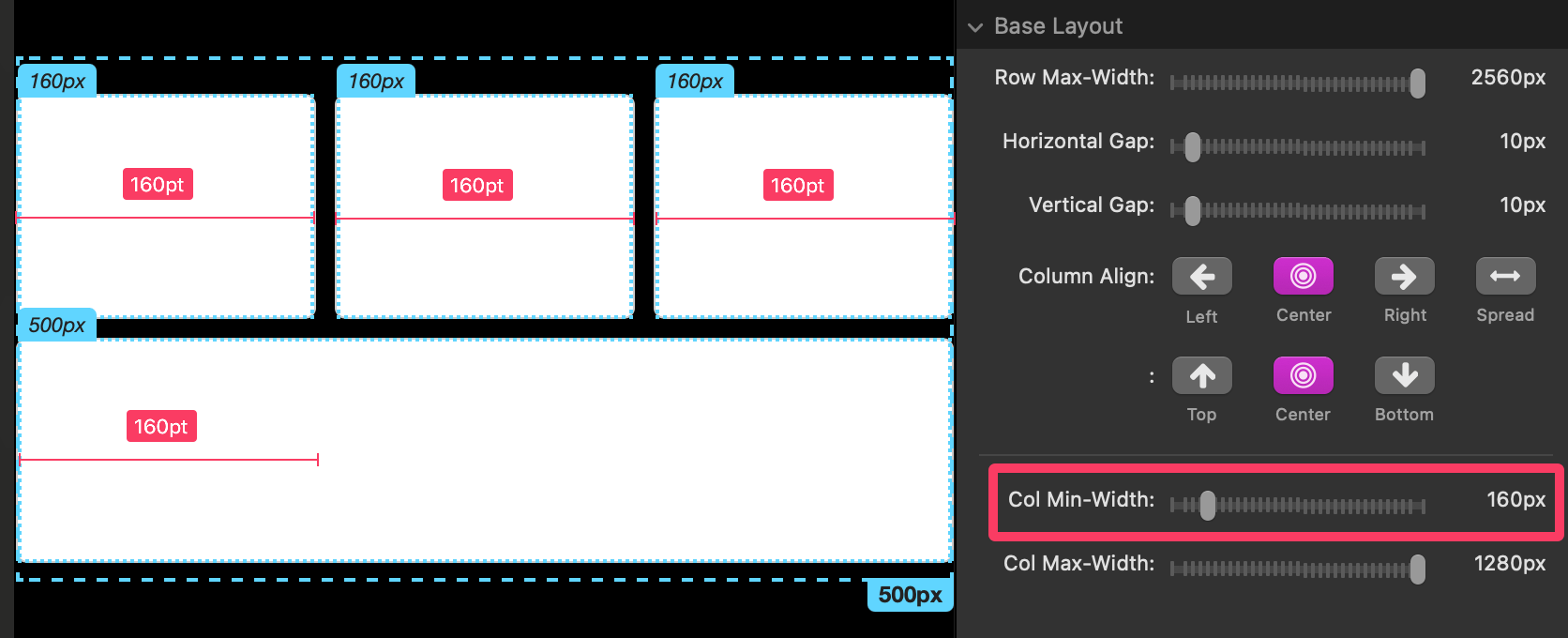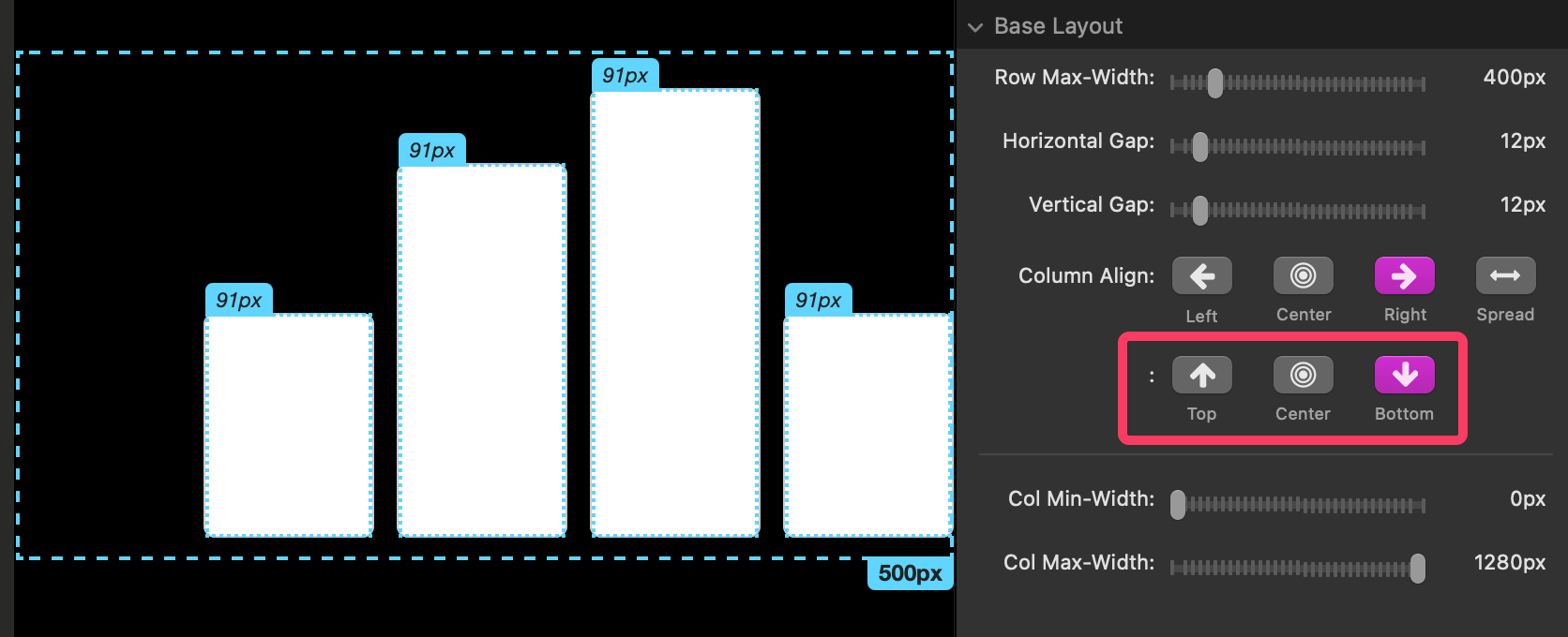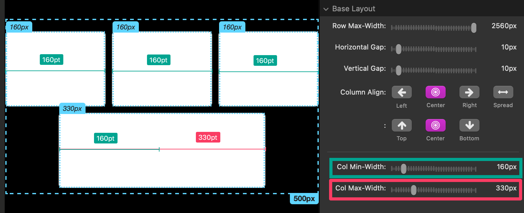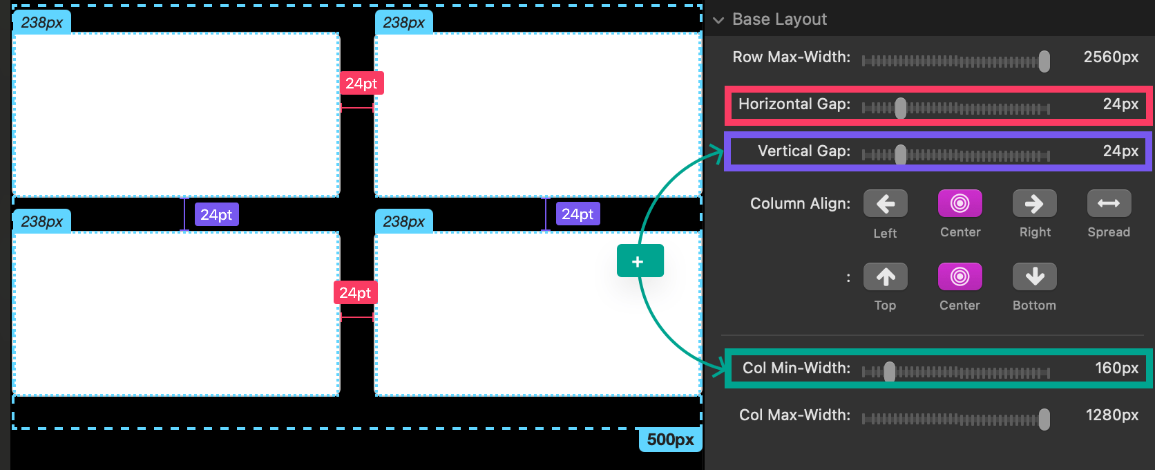 - If (columns × Col Max-Width) + (gaps) is less than Row Max-Width, Column Align (Left/Center/Right/Spread) determines how the leftover space is handled.