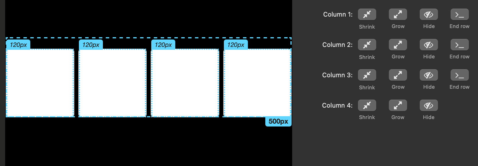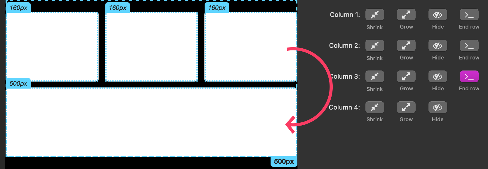 - If the row gets narrower than the total needed space, overflow columns wrap to a new row.