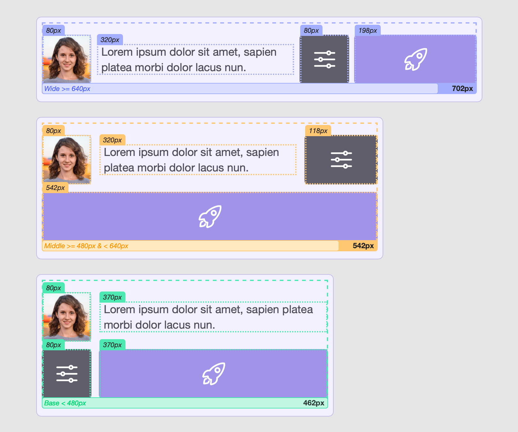 - Example: Base < 640 px, Middle 640–959 px, Wide >= 960 px.