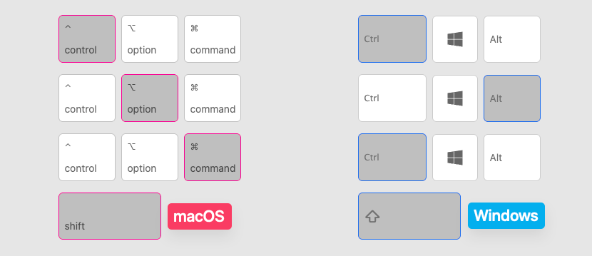 Each option shows the corresponding key for both macOS and Windows keyboards. Choosing Custom allows you to define your own keys—separately for macOS and Windows.