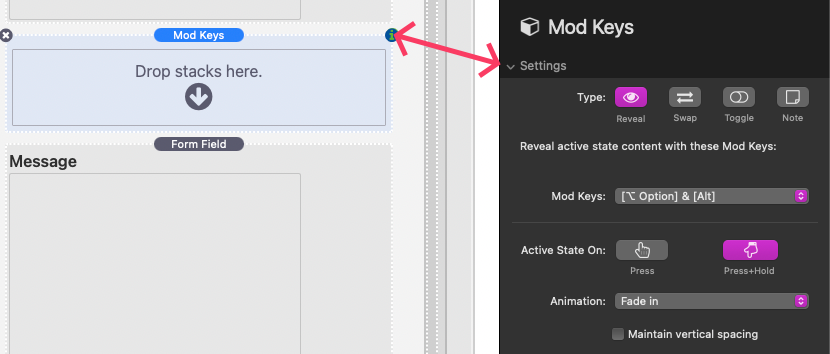 To begin, add a Mod Keys stack to the area in the editor where you want mod key–activated content to appear. Then, select the stack and open the settings panel.